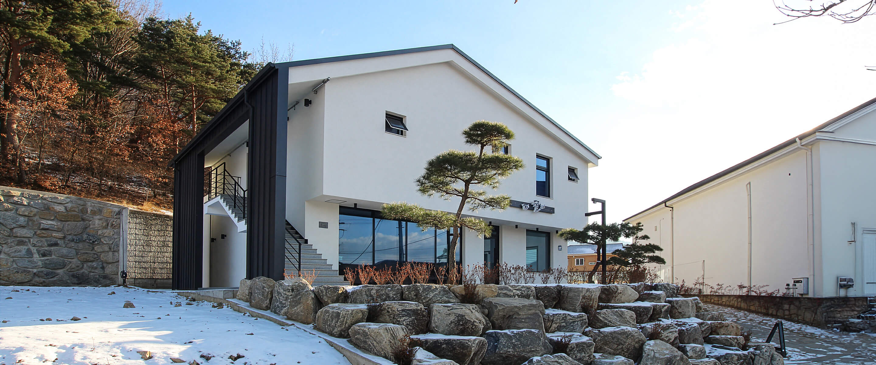 주변 풍경을 가리지 않는 매스 구성과 단정한 박공지붕 라인으로