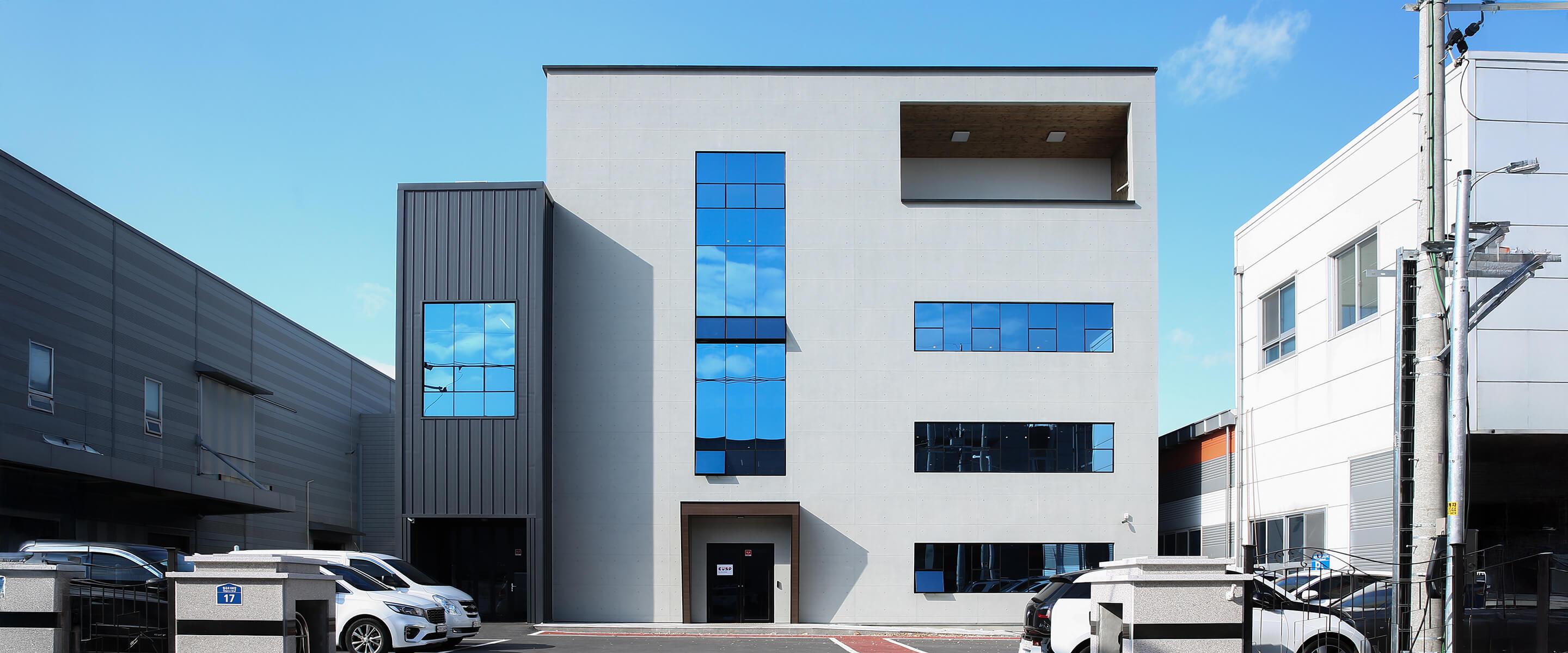 노출 콘크리트와 금속 마감의 대비가