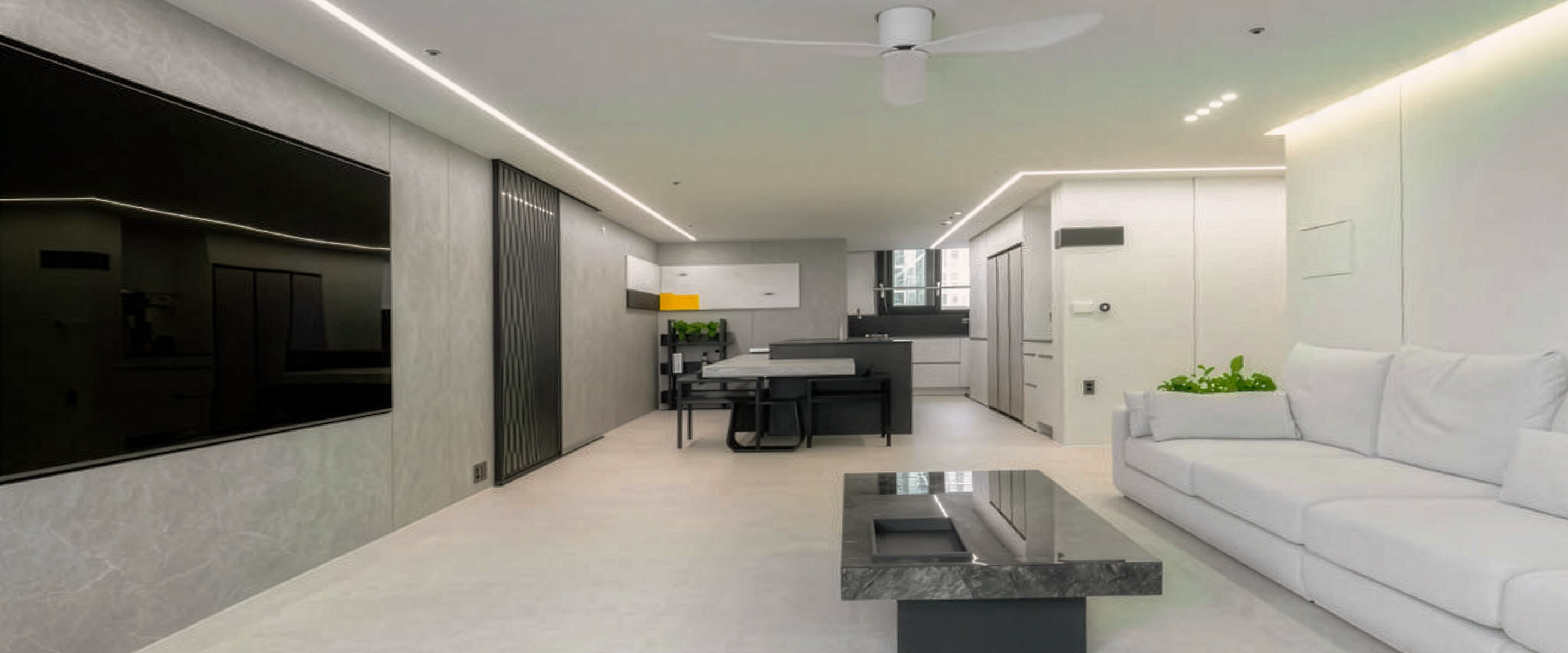 천장을 가볍게 띄워, 화이트-그레이-블랙 톤온톤의 명암만 남겼습니다.