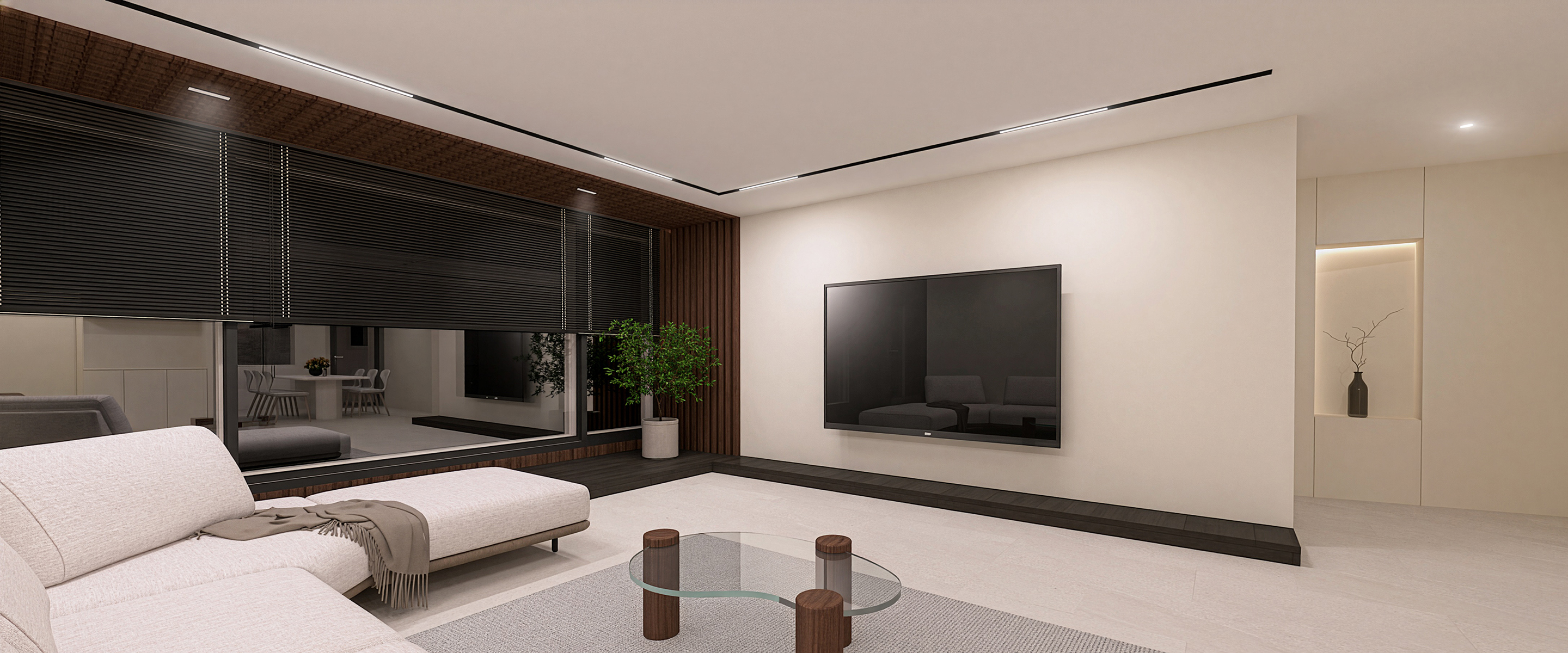 거실은 대형 블라인드+우드 프레임으로 창을 ‘ 뷰 프레임 ’ 화하고,