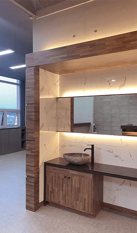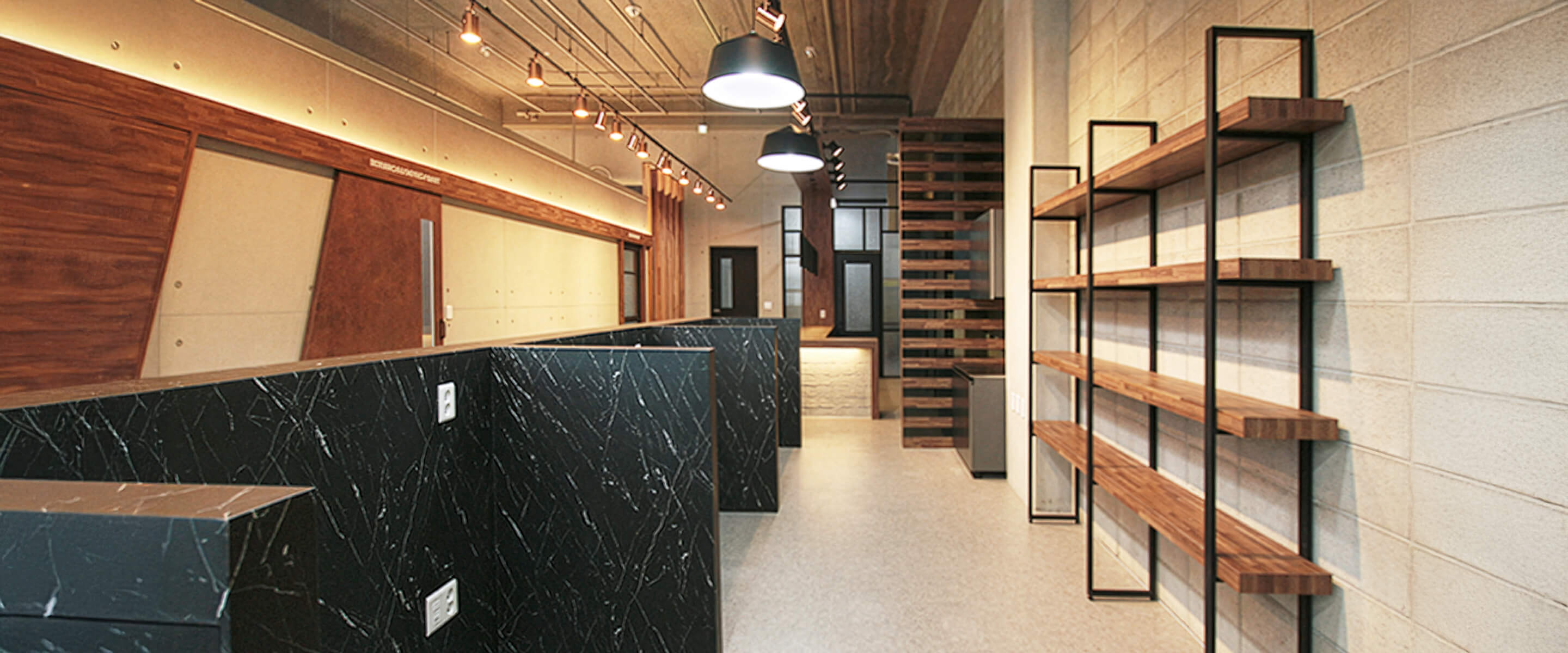 블랙 파티션과 우드 마감의 대비, 블록 텍스처와