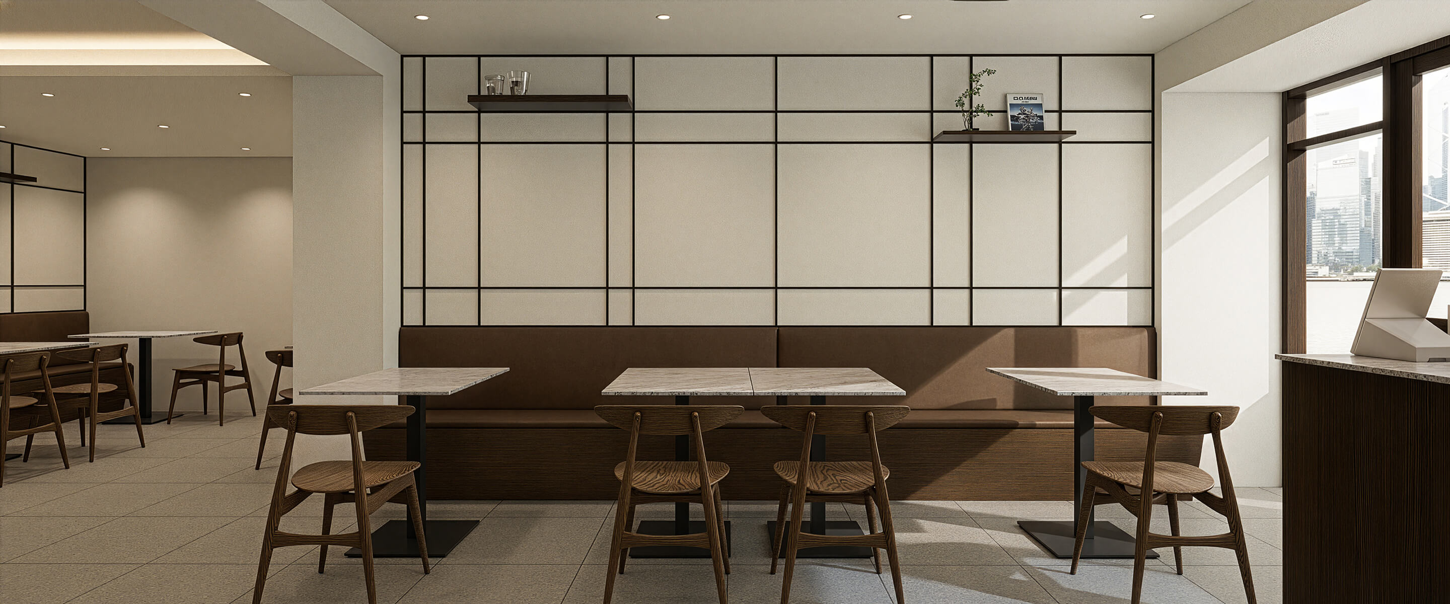 청도 상가 인테리어는 밝은 베이지 톤 위에 짙은 우드를 얹어,