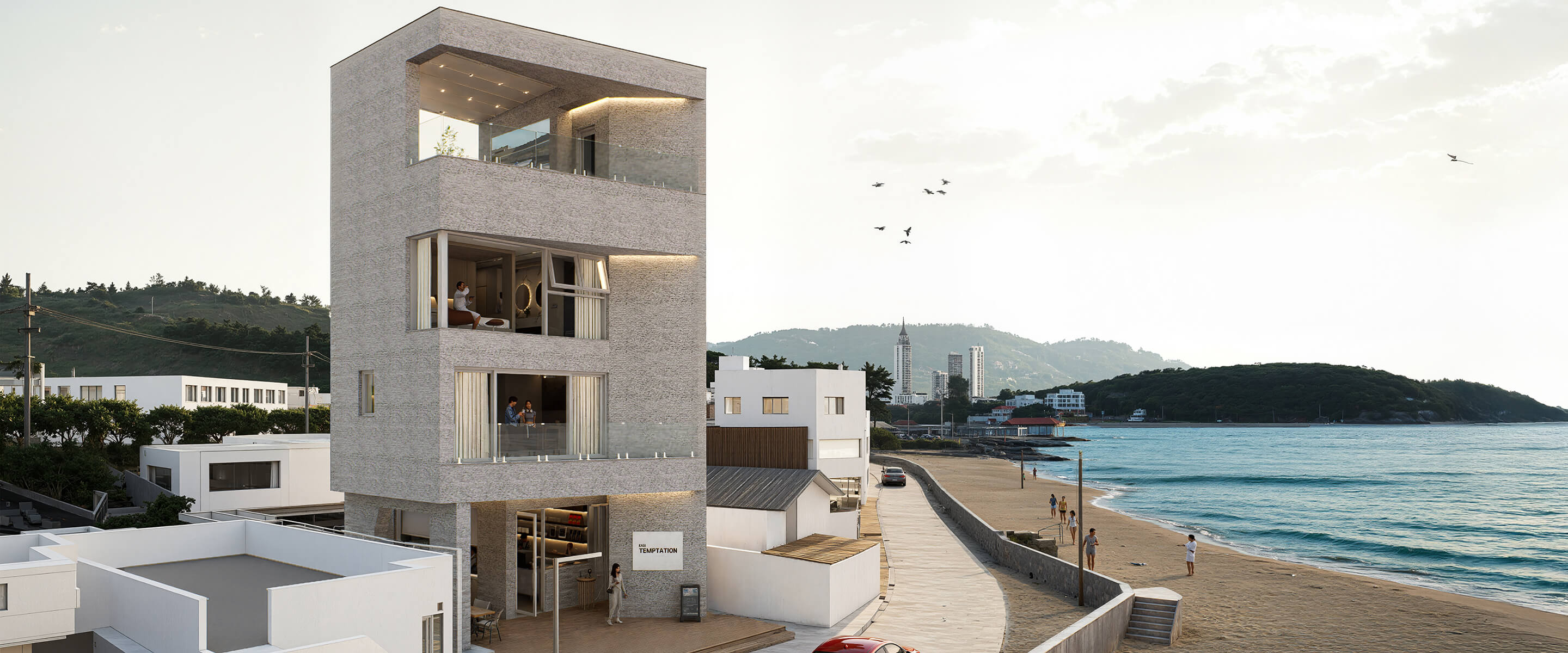 거친 텍스처 외장과 입면의 빛 · 그림자 변화로