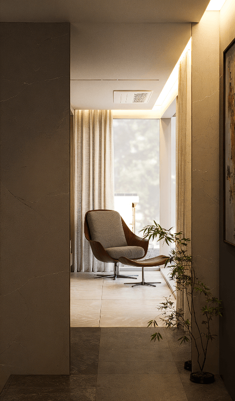 공용 라운지는 다크 우드 · 스톤 톤으로 휴식의 밀도를 남기고,