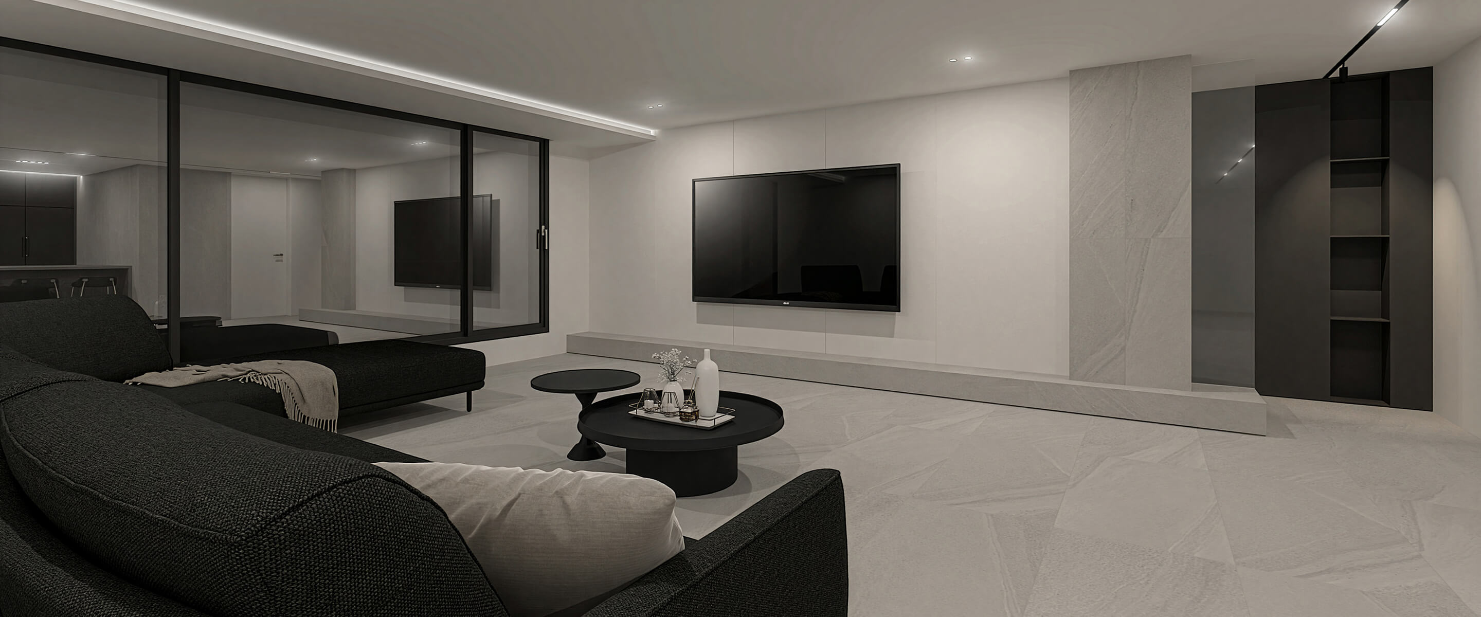 거실은 긴 TV월과 낮은 가구 배치, 대판 타일 톤으로