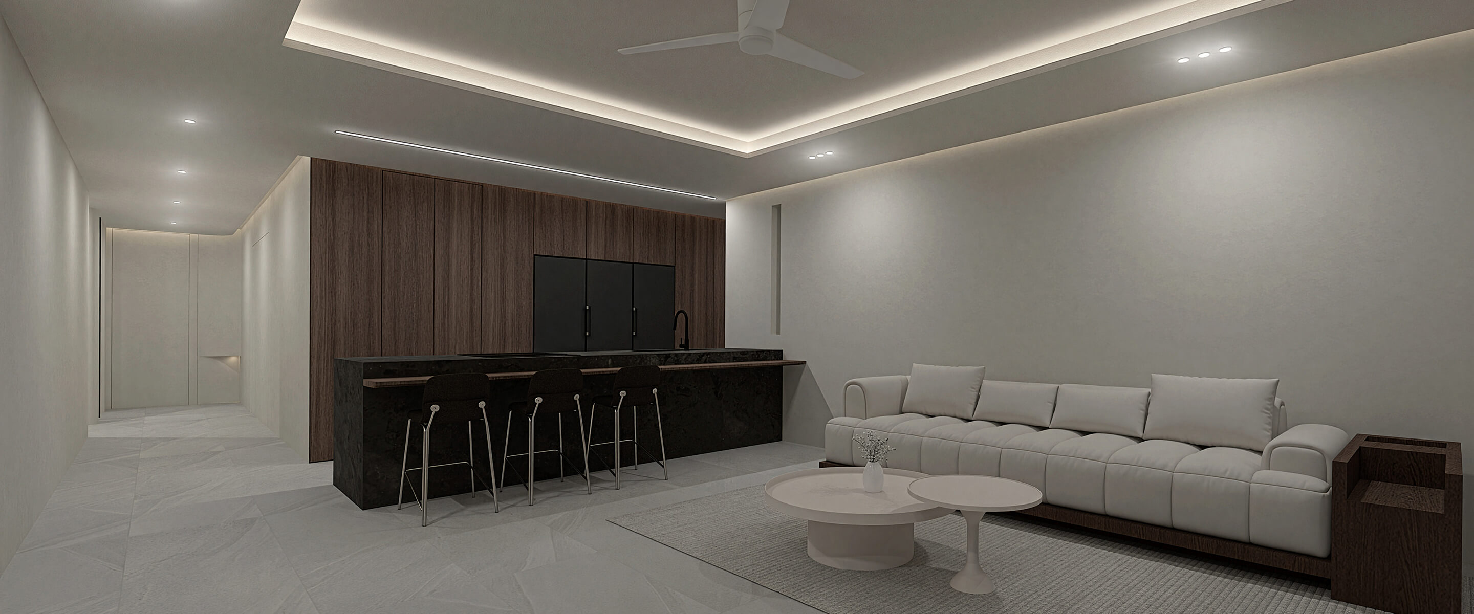 베이지·월넛 톤을 기본으로 거실은 긴 벽면과 매입 조명으로