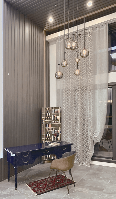 간접조명+다운라이트로 질감은 살리고 밝기는 균일하게 정돈했으며,