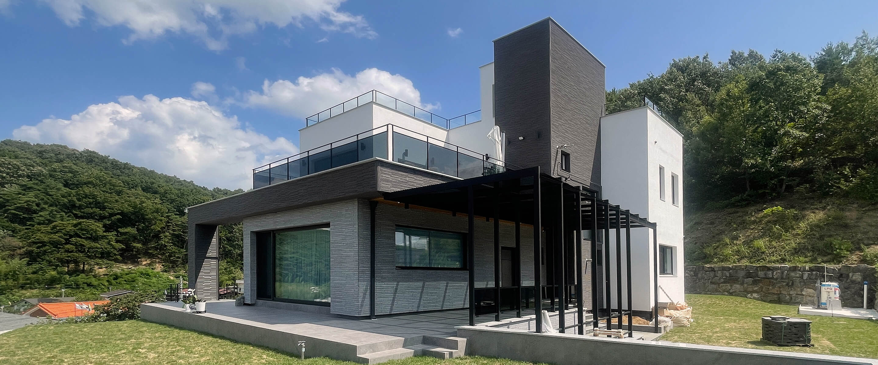 화이트 톤 외관에 짙은 마감과 선형 요소를 더해 풍경 속에서도