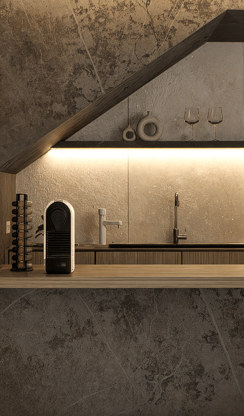 공용 라운지는 다크 우드 · 스톤 톤으로 휴식의 밀도를 남기고,